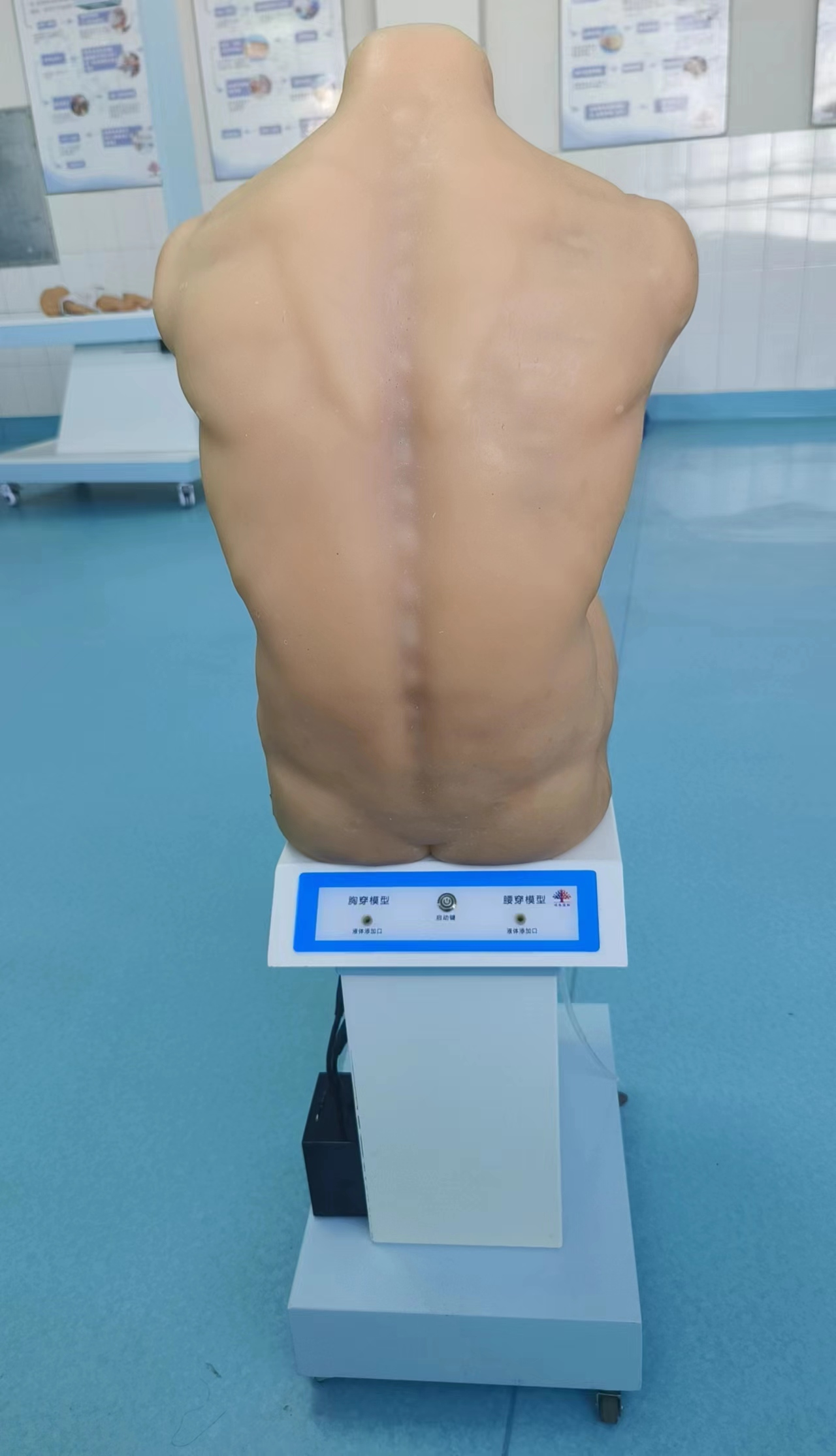 2.仿真人體模型采用合成硅橡膠,一次性澆鑄成型(包括胸腔囊、脊柱椎管等),皮膚完整質(zhì)感逼真,外形美觀(guān)(逼真)臨床體表穿刺定位標志清晰。體內按人體解剖位置設置有肩胛骨,肋骨,脊柱(胸椎、腰椎)、椎管、髂骨,病理狀態(tài)下的胸腔囊。在體表可清晰的分辨出斜方肌、背闊肌、骶棘肌、雙側髂后上棘。用手可觸摸到肩胛骨、肋骨及肋間隙、脊柱及腰椎間隙,提供給練習者按臨床體表定位標志進(jìn)行穿刺練習及考試。