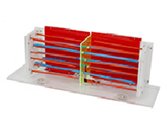 BST/MX20545 骨骼肌+肌節收縮變化放大模型用人體模擬材料制成,顯示一個(gè)骨骼肌的肌節,從一面表現光鏡下骨骼肌肌節的分帶,即明帶(I)、暗帶(A)、H帶M膜、乙膜,從另一面示粗絲和細絲,以立體結構反映它們在肌節中的分布規律,粗絲位于A(yíng)帶,細絲位于I帶及伸入A帶接近H帶,一根粗絲周?chē)鳛榱呅闻帕兄?zhù)六根細絲,一根細絲周?chē)嗜切闻帕腥纸z,肌節有1/2 I帶+A帶+1/2 I帶組成,肌纖維收縮時(shí)細絲向粗絲之間滑行,光鏡下結構則H帶消失,I帶變窄。