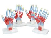 BST/MX20801 手肌解剖模型用人體模擬材料制成,一套四只,在腕掌側韌帶上方水平橫切,分別由淺入深層層解剖,主要顯示手背和手掌部的肌肉、肌腱及橈以及尺側囊,在手掌側可示外側、中間和內側三群,還顯示前臂肌肉的肌腱達手背、手掌部的止點(diǎn)。